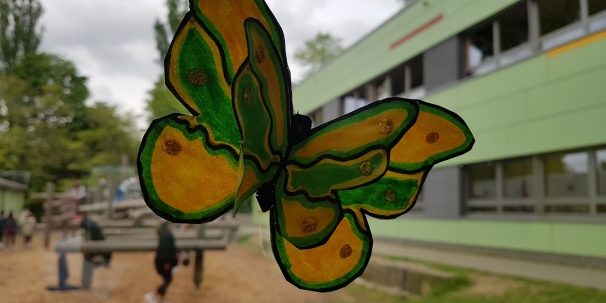 Im Frühjahr hatte Frau Gontscharow eine tolle Idee für ein klassenübergreifendes Kunstprojekt an der Geschwister-Scholl-Schule: Die großen Fenster im Foyer sollten mit Schmetterlingen und einem passenden Spruch verschönert werden. Sie erstellte für die verschiedenen Altersgruppen geeignete Vorlagen und viele Klassen bastelten in den folgenden Wochen Dutzende schöne Schmetterlinge. In mühevoller Detailarbeit fügte Frau Gontscharow dann die einzelnen Bestandteile zu einem Gesamtkunstwerk zusammen und die ganze Schulgemeinde erfreut sich seitdem an dem außergewöhnlichen Anblick.