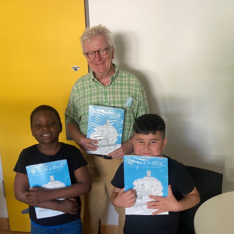 Herr Schuld von der Schuld-Stiftung Wiesbaden hat unseren Schülerinnen und Schülern mit nichtdeutscher Herkunftssprache Ekko-Malbücher überreicht, um auf diesem Weg die neue Heimat entdecken zu können.